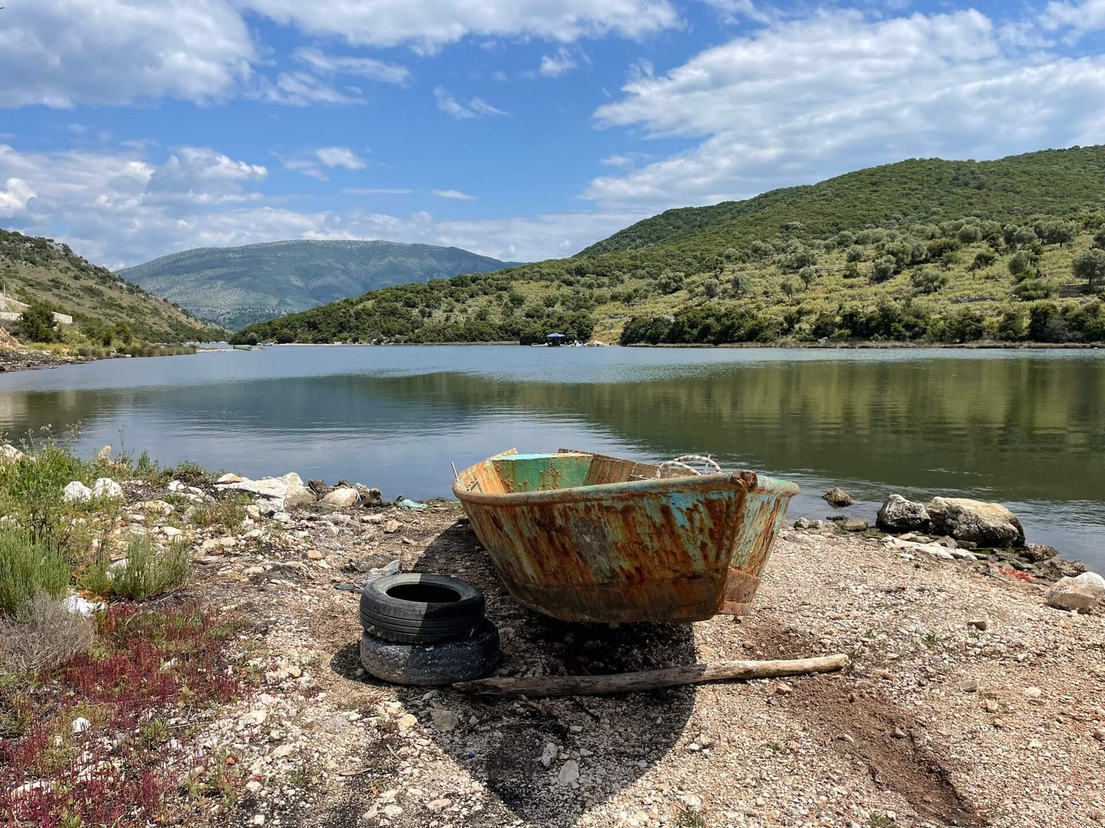 Ksamil doet denken aan het schiereiland van Dubrovnik. Het ligt ook op een schiereiland en is omgeven door de Ionische zee, het meer van Butrint en Butrint national park. In deze omgeving voelen we ons ook wel thuis. Aan het Butrint meer (400 meter vanaf de bungalow) vindt Martijn een lege fundering van een niet gebouwd huis. Hoe zou het zijn om hier te wonen? We fantaseren om er een caravan weg te zetten waar we dan een deel van het jaar in kunnen wonen.