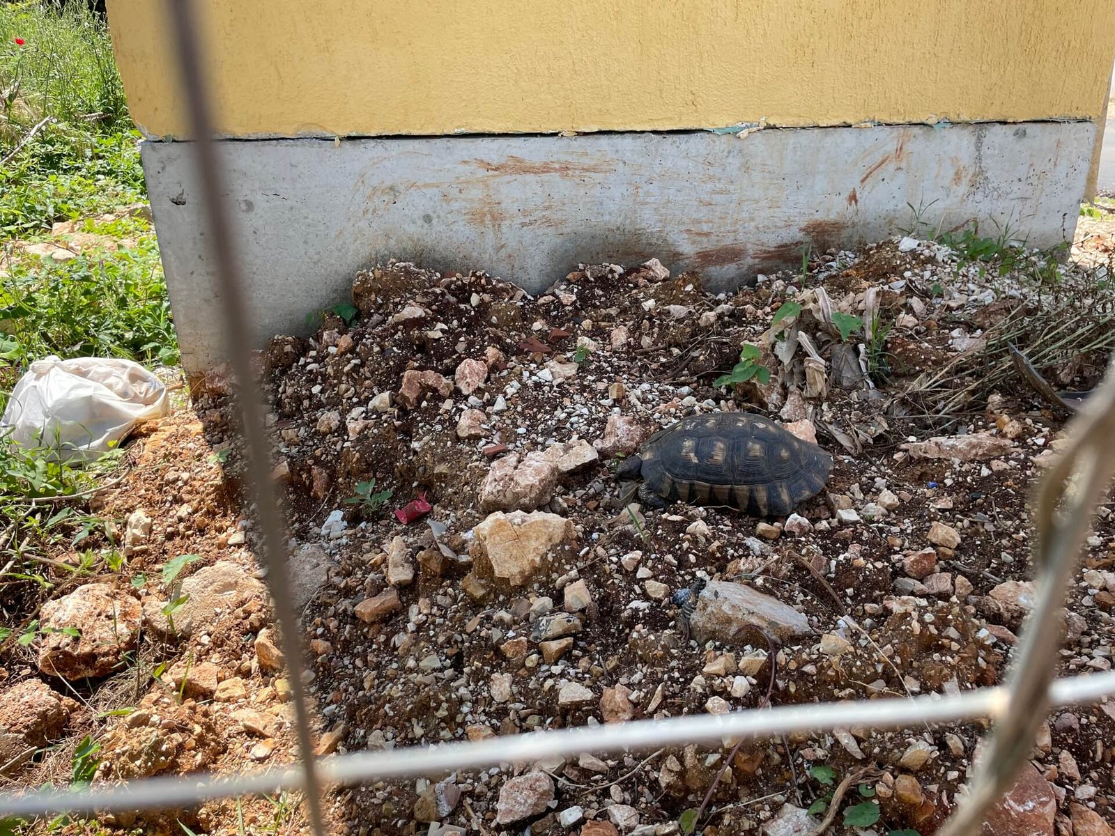 We zijn thuis als James in de tuin benieuwd tekeer gaat. Kitty spurt naar buiten, wat is er aan de hand? Iets bij het hekje. Oh dit is geweldig, we weten dat ze hier rondlopen maar nog niet gezien. James ziet net buiten ons tuinhekje een schildpad! Het beestje is veilig want er is een hek. De telefoon erbij want dit moet op camera en dat lukt. Weer een nieuwe ervaring, erg leuk.