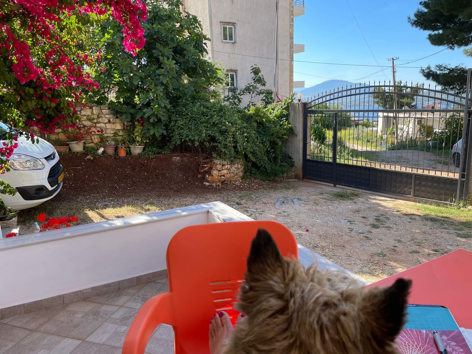 In Ksamil vinden we een vrijstaande bungalow. Tijdens het verblijf in Sarandë rijden we er alvast langs, het is maar een half uur verderop. Dit ziet er goed uit en we boeken vijf nachten. Bij aankomst in de bungalow worden we ontvangen door de dochter van de eigenaar. Zij heeft ook een hond en is meteen verliefd op onze honden.